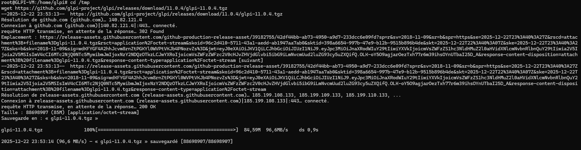 Puis téléchargé le dossier compressé de GLPI 11.0.14 dans le dossier tmp (temporaire) :