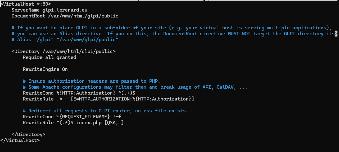 Au début il y à "ServerName", vous pouvez mettre ce que vous voulez, mais c'est recommandé de mettre le même nom de domaine qu'il y à en interne (si vous avez un nom de domaine en local), si vous désirez de mettre un certificat TLS/SSL pour l'https par exemple.