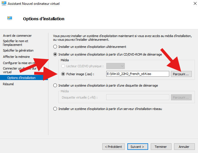 Puis on poursuit avec la sélection de l'installation par le choix de l'iso pour installé le système. Je prends pour mon cas Windows 10 :