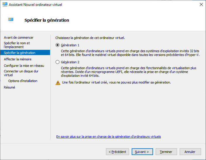 Une fois fait suivant, il nous demande la génération. La génération est bien pour les vieux systèmes (avant Windows 7 et les vieilles versions de Linux), mais les récents passent quand même et la génération 2 est uniquement pour les systèmes récents (après Windows 7 et version récente de Linux). Pour ce tuto, je vais prendre génération 1. La génération 2 je là ferais dans un seconds tuto :