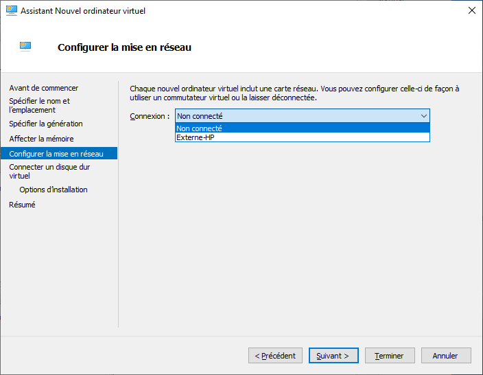 Après avoir fais suivant, on dois selectionné un commutateur virtuel, vous pouvez laissé en "Non connecté" ou pour mon cas le mettre le commutateur virtuel créée "Externe-HP" :