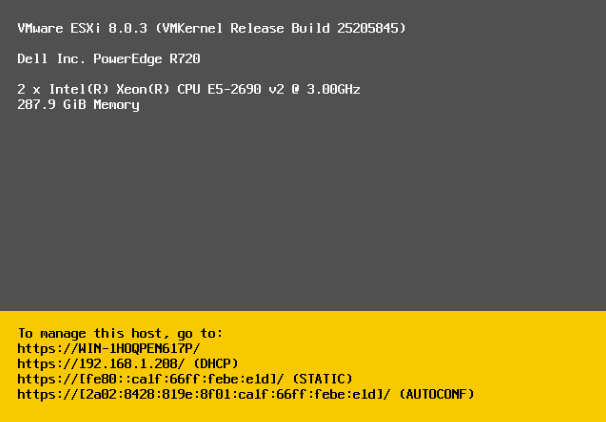 Une fois redémarré, nous allons arriver sur la console d'administration de ESXi. Ici nous allons juste regarder l'adresse IP pour accéder à l'interface web :