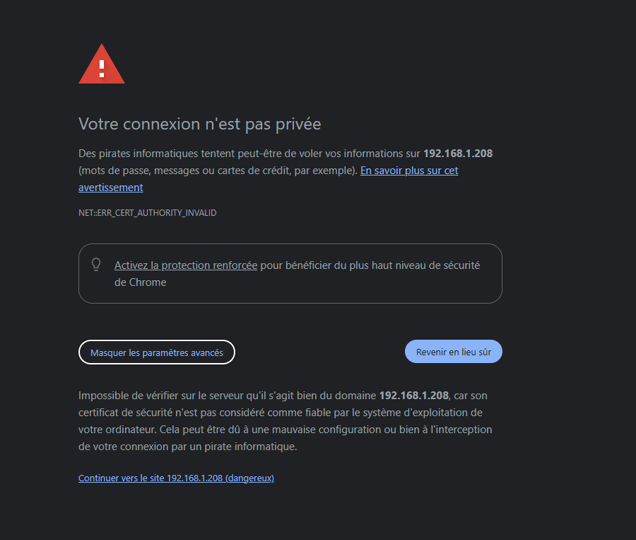 Puis nous allons la taper dans le navigateur, le navigateur va dire que cela est dangereux car le certificat du https est autosigné (donc pas d'une autorité certifiée et sûre) mais nous faire paramètre avancé et faire continuer :
