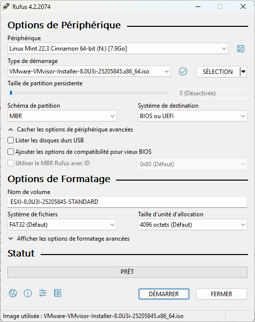 Je vais installer ESXi par clé USB et pour créer cette clé USB j'utilise Rufus :